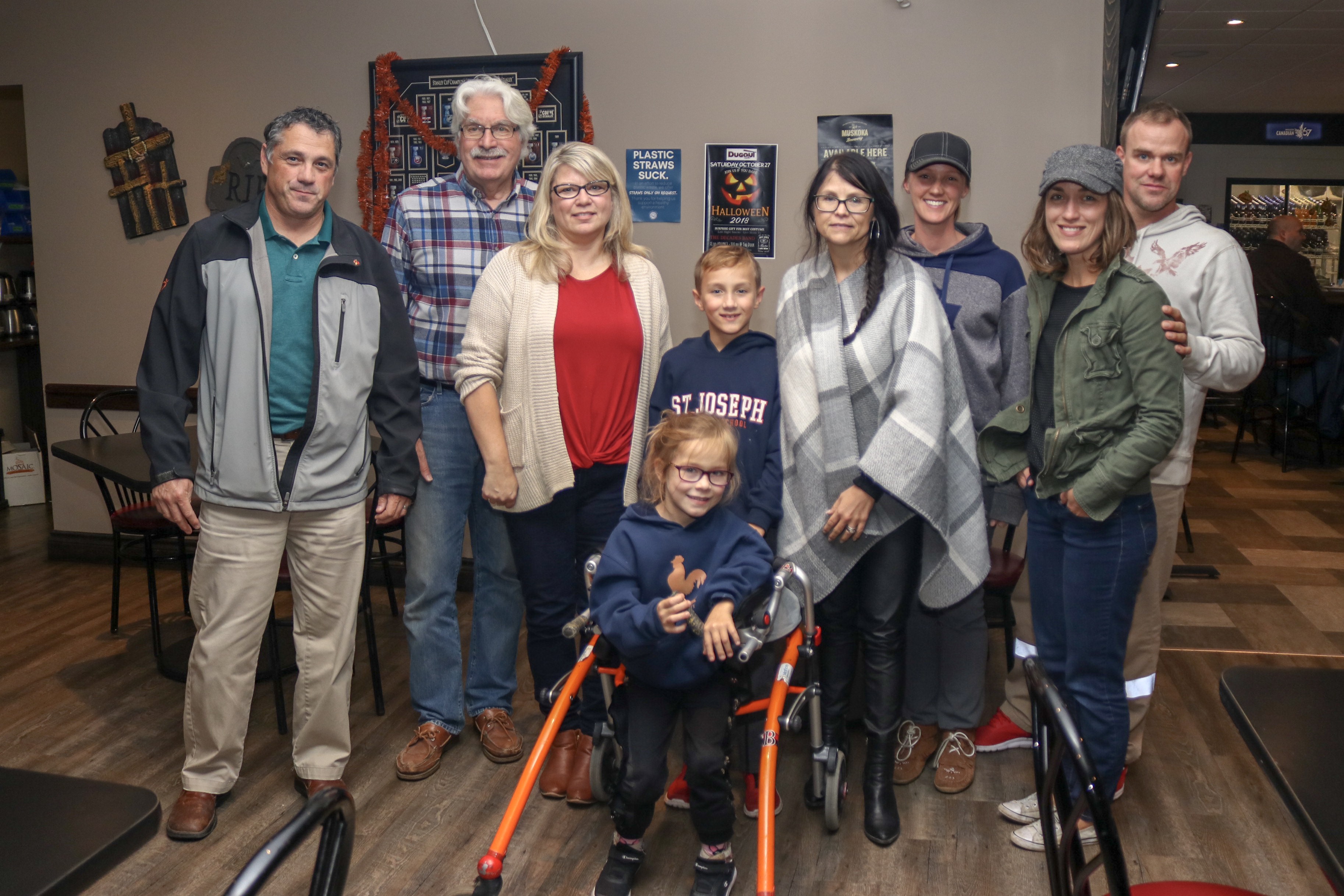 Field of Ability members (from left) Rob Cowell, Geoff Cudmore, Lisa Newman-Chesher, Isaac Whalen, Aurora Whalen (in front of Isaac), Tracey Peny, Sarah Collins, Kristen Whalen and Chris Whalen gathered at the Dugout Restaurant in Belleville Monday night to meet a Kraft representative and plan their campaign to gather votes for Kraft Heinz Project Play. Photo by Brett Bullen, QNet News