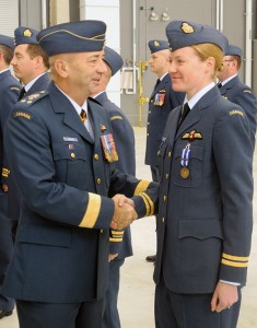 TRENTON (16/11/12) Cpt. Sophia Polwin recieves her medal from the Commander of the Royal Canadian Air Force, Lieutenant-General Yvan Blondin. Photo by Kristen Oelschlagel.