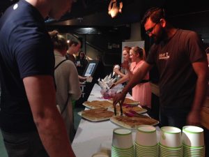 Students lined up at a table to be served by each of the candidates. The room was filled with conversation and upbeat music, adding enthusiasm to the general mood of the event.
