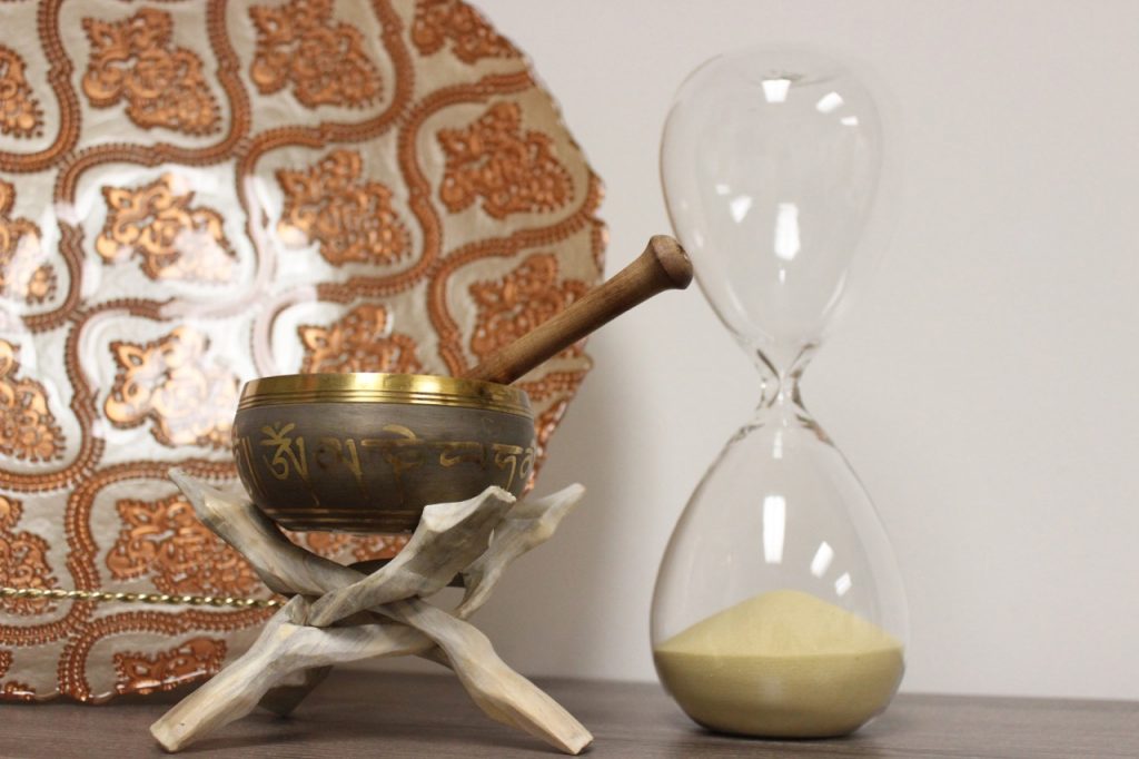 Studio owner Sam Summers uses a singing bowl at the end of her meditation sessions, and it creates sounds that help balance her clients’ minds, bodies and souls. Photo by Sarah Law, QNet News
