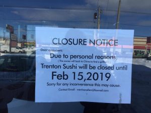 Trenton Sushi closed on January 2 and reopened on March 4. In the meantime, many customers were left without their go-to restaurant while the owner was looking to find his special person. The restaurant left this note giving more insight into the situation. Photo Courtesy Laura Maathuis