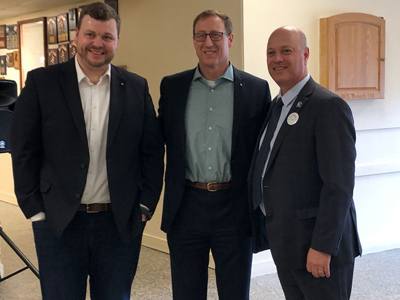 Belleville mayor Mitch Panciuk (r) stopped by the Legion in Trenton to welcome Conservative leadership candidate Peter MacKay (c) along with former Bay of Quinte Conservative candidate Tim Durkin (l) Monday. Photo by Ryan Peddigrew