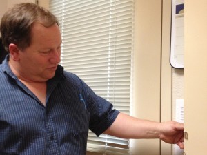 Paul Latchford shows the marks from when his door was pried open last week. Photo by Sam Normand.