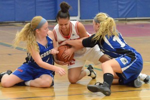 Loyalist’s Amber Burton fights Grizzlies’ Kara Faulkner (left) and MacKenzie Merkley (11) for the ball. Athletes may have trouble getting recruited this year due to a lack of high school sports. Teachers are boycotting sports because of Bill 115.