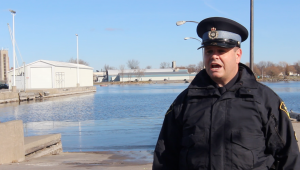 Quinte West OPP officer David Ludington at the boat ramp that Charles Dopking, one of two missing boaters, launched from Tuesday night. Photo by Jack Carver.