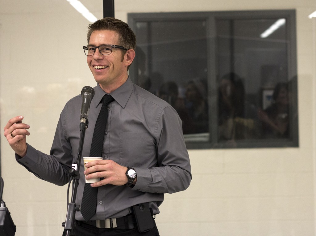 BELLEVILLE – Mandolynne Knott talks to the crowd about her love for art and why she loves Loyalist’s Art and Design Foundation program. Students in the program curated the show, and at the opening all had the opportunity to come up and say a little about about what they do and why they love it. Photo by Sonya Dronsfield, Loyalist Photojournalism