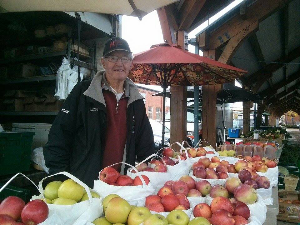 Fosterholm Farms owner Clifford Foster shows off fresh apples at his Belleville farmers’ market stand Thursday morning. They’re some of the fruits and vegetables he now sells after switching from dairy to produce – a move he says was prompted by competition from outside markets. Photo By Brendan Burke/QNet News
