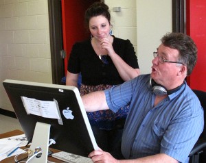(Belleville, Ont. 05/18/11) QNet Newsroom editor Mike Beaudin explains a new concept to Ashleigh Gehl during a work session in the newsroom at Loyalist College. Gehl is part of the Journalism Online Print Broadcast program at Loyalist. Photo by Jennifer Bowman