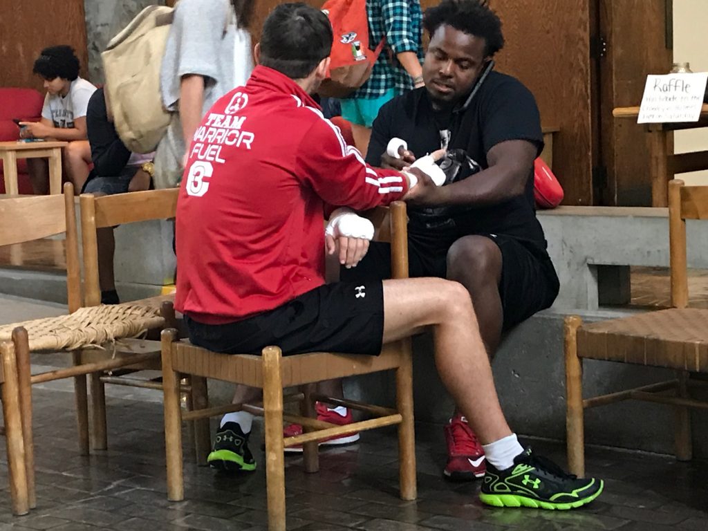 Professional boxer Cody Crowley getting ready with his coach Ibn Cason for his training session at Trent University’s Champlain College. Photo by Daniel Taylor, QNet News