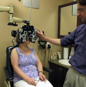 BELLEVILLE, ON (27/06/11) Dr. John Wareham gives Paula Lahey an eye exam at his offices on Sidney Street. He said eye exams are free under OHIP and recommends children should have their eyes examined at eight months. Photo by Steph Crosier