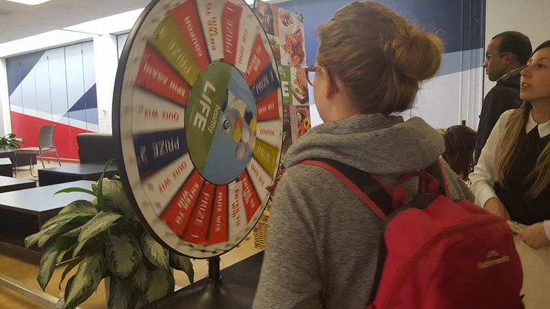 Alexis Devries, a first-year Loyalist College nursing student, takes a spin as part of the activities offered in the cafeteria. Devries said she feels lucky to have won a $50 campus book card, a drink and saved $1 on her choice of carnival snacks provided. Photo by Demii Niles, QNet News