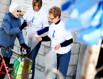 Members of the Violence Awareness and Random Acts of Kindness program hand out royal blue bows. The bows and ribbons are a visual reminder that violence makes victims of us all and to encourage Random Acts of Kindness. Photo credit to varak.com