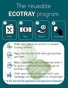 The university’s cafeteria offers reusable and washable EcoTrays for a one-time cost of $5. (By comparison, students pay $1 each time they get a traditional take-away container.) Students return the EcoTray to get it washed, and receive an exchange card so they can get another one free the next time they eat. The program was introduced about four years ago.