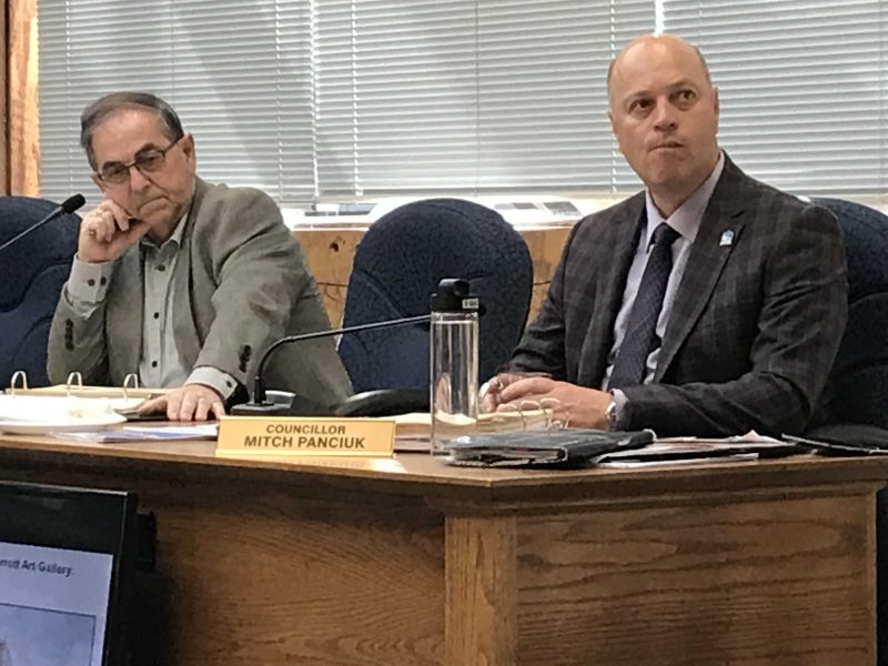 City councillors Garnet Thompson (left) and Mitch Panciuk listening to a presentation at Tuesday’s budget meeting. Photo by Michael Fleming, QNet News