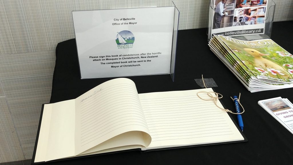 A book of condolences has been placed at the Belleville Public Library for people to stop by and sign. The book will be there for one week, after which it will be sent to the mayor’s office in Christchurch.