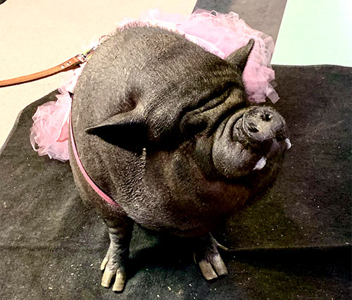 Molly the Therapy pig came in tutu on Thursday for students to pet and take pictures with. Photo by Olivia Waldriff, QNet News