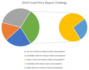 A double pie chart representing the Food Price Report findings. The green wedge represents the combined percentages of those planning to reduce their meat consumption.