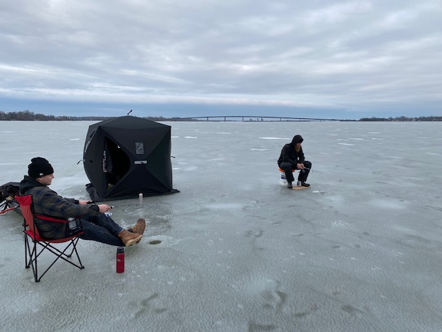 “As someone who doesn’t have a boat, ice fishing is great because you can just walk out to the best places to fish. So the slow start (to the season) has been unfortunate,” said Riley Deveau (left), seen here fishing with a friend on the Bay of Quinte this week. Photo by Thomas Goyer, QNet News