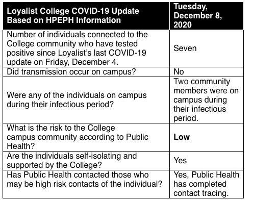 According to the Hastings Prince Edward Public Health [3] Unit information circulated by the college, the seven new cases are a low risk for transmission to the college campus community. Only two of the seven students were on campus during their infectious period.