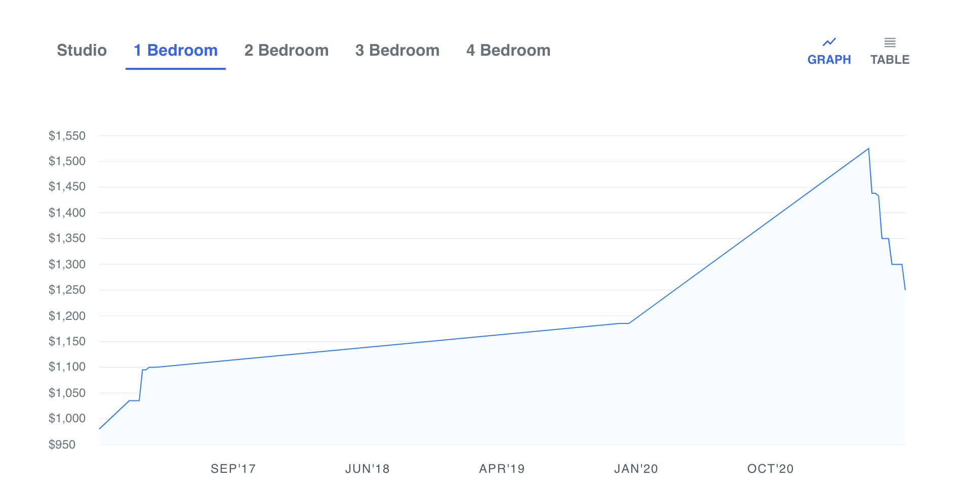 Graph of rental costs in Belleville for a one bedroom unit. Graph via https://www.zumper.com/rent-research/belleville-on