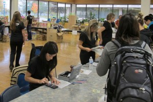 Customers pay for their items at the table while public relations students work in the back to get all the items organized during October's truckload sale. Photo by Taylor Renkema