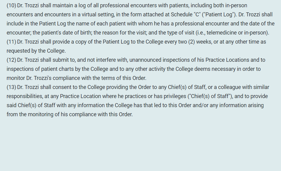 “If providing care in a virtual setting, Dr. Trozzi shall display the sign to the patient at the outset of the patient encounter,” says the CPSO website.