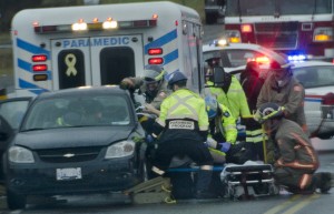 BELLEVILLE, Ont. (29/11/2011) Driver Danny Howsen was extracted from his car after the Hastings-Quinte Emergency Medical Services paramedics and the Belleville firefighters from Station 1 detached the driver's side door of his car with the Jaws of Life. Howsen was involved in a four-car accident at the intersection of Wallbridge-Loyalist Road and Moira Street on Tuesday morning around 10 a.m. He was taken to Belleville General Hospital and the accident is still under investigation. Photo by Julia McKay