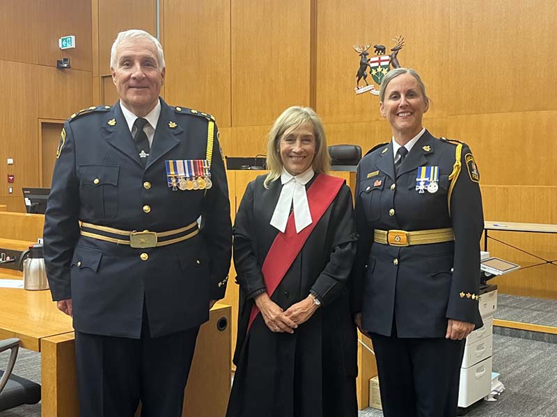 New police Chief Murray Rodd, Honourable Justice Elaine Deluzio, and new deputy chief Sheri Meeks photographed after the swearing-in ceremony. Photo by Sam Franks.
