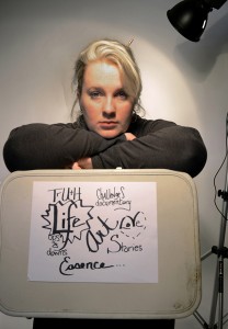 BELLVILLE, Ont. (15/01/12) - T.J LeBlanc sits with a piece of her luggage with her "baggage words". LeBlanc started The Baggage Project when she got the idea to do a word photography project. Participants of the project choose their luggage and "baggage" words and then pose in the nude. Photo by Linda Horn.