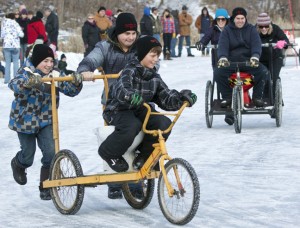 BELLEVILLE, Ont. (29/01/12) Zackery Lowery, 12, Alex Roy, 13, and Hunter Storms, 9, race their way into first place at Stirling's annual Toilet Bowl Race Sunday afternoon. The race was organized and sponsored by Josh Skinkle of Skinkle Custom Manure Spreading. Photo by Topher Seguin.
