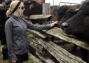 STIRLING, Ont. (02/05/12) It is the first time Centre Hastings Secondary student Kelsey Davidson has encountered a water buffalo. A week long cycling trip, part of the highschool's Eco Quest program brought the students to Martin Littkeman and Lori Smith's Water Buffalo dairy and meat operation in Stirling.Photo: Gail Paquette