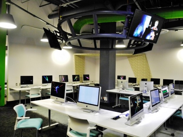The Digital Media Centre has fantastic new details, including innovative architectural design. The walls are decorated with murals, and the desks are crowded with the latest technology. These photos, taken by Matt Blair, illustrate the Digital Media Centre’s first day.