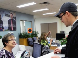 Loyalist College admissions receptionist Kathy Luffman helps second-year social-service-worker student Cody Boying during his visit to the financial-aid office. Photo by Amanda Lorbetski