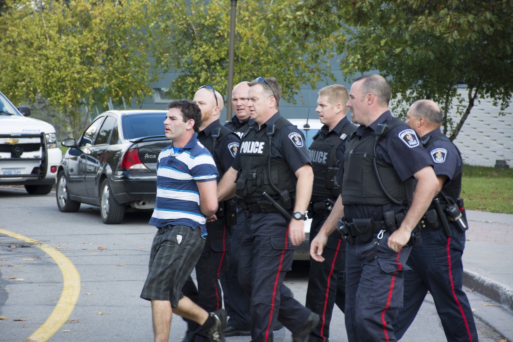 Police take a man into custody following an incident on campus at Loyalist College. Photo by William Acri