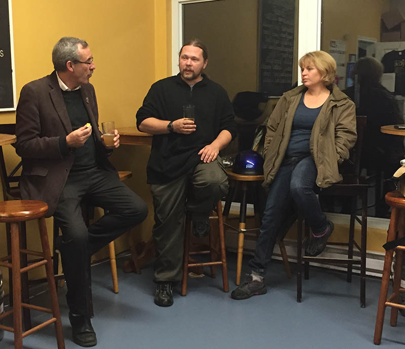 Terry Cassidy (left), the New Democratic Party candidate for Bay of Quinte riding in the federal election, discusses the outcome with supporters at his election-night party at the Wild Card Brewery in Trenton. Photo by Stephanie Clue, QNet News