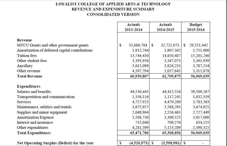 A summary of Loyalist College’s finances for the past three years. After running deficits the past two years, the college plans to return to a balanced budget in 2015-16. Photo courtesy of Loyalist College