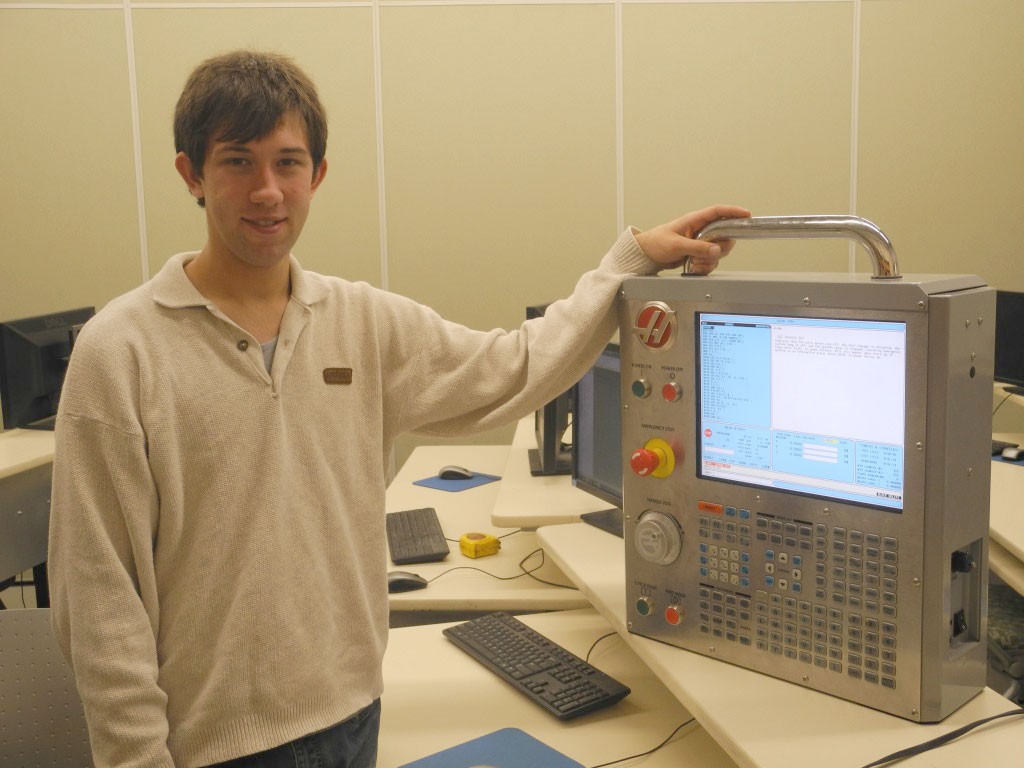 Nathan Blok with manufacturing equipment at Loyalist College. Blok came to Loyalist for a backup option in case his championship racing career does not work out. Photo by Joseph Quigley, QNet News