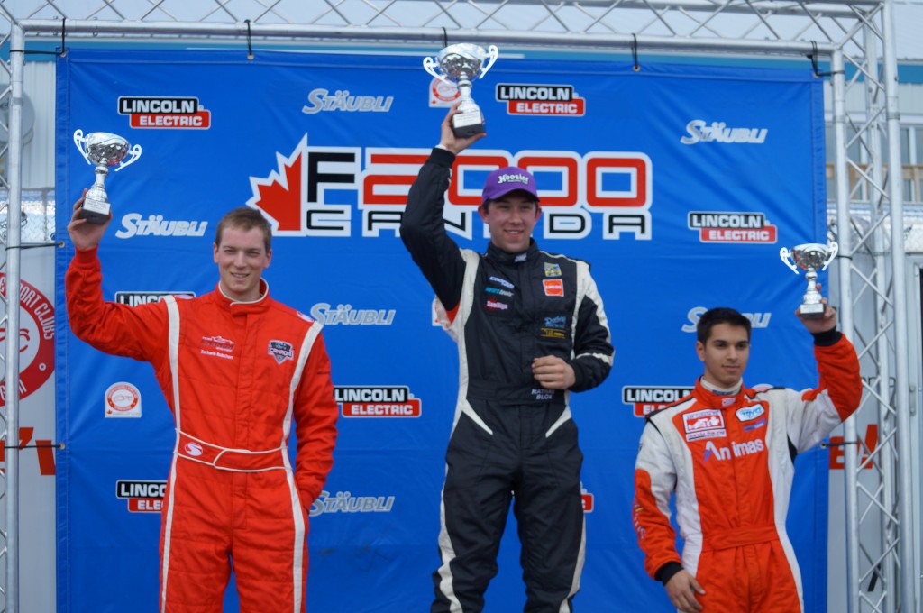 Nathan Blok (centre) standing victorious on the podium after a race at Canadian Tire Motorsport Park in Bowmanville, Ont. May 2, 2015. The race was part of the Canadian F2000 series. Zacharie Robicon came in 2nd (left) and Chase Pelletier came in 3rd for the race. Blok would go on to win the F2000 championship. Photo courtesy Nathan Blok