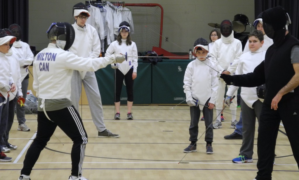 BELLEVILLE – Rob McFadden (at right, in black), demonstrates fencing skills under the watchful eyes of his students at the Loyalist Fencing Club. Photo by Buckley Smith, QNet News