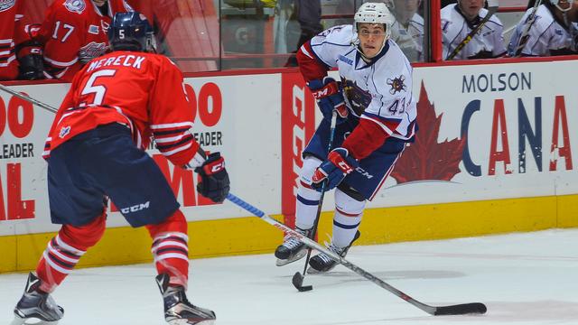 Hamilton Bulldogs left-winger Michael Cramarossa (No. 43, right) said he misses playing in Belleville. “It was a great community with a lot of great fans,” he said. Photo courtesy of hamiltonbulldogs.com