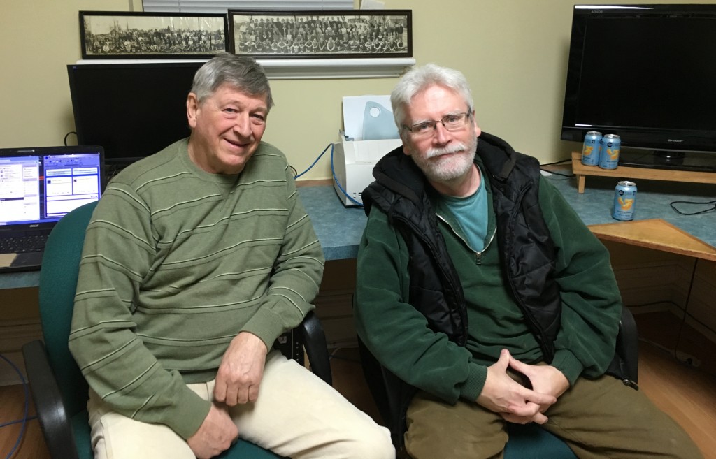 John Docherty and Phil Martin of the Stirling-Rawdon Genealogy Society at their work stations at the village’s library. Photo by Angus Argyle, QNetNews