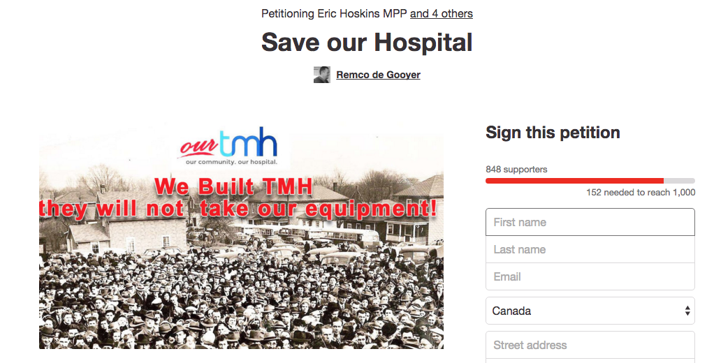 An online petition by the Our TMH community advocacy group. The group seeks to stop a proposal to move day surgeries and hospital equipment from Trenton Memorial Hospital to Belleville. Photo courtesy Our TMH