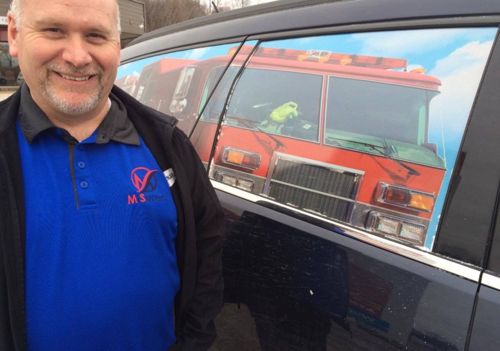 Tim Newman with his MiSyren branded vehicle. Photo by Justin Medve, QNet News