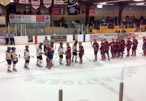 The Wellington Dukes and Aurora Tigers shake hands following the deciding game six win by the Dukes on Monday, March 14th. Photo by Tim Durkin.
