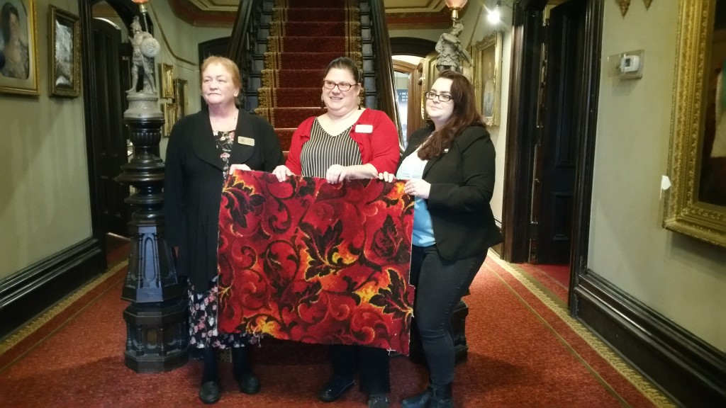 Rona Rustige, Melissa Wakeling and Danielle McMahon-Jones holding a cut of the recently replaced carpet at Glanmore house. Photo by Jaykob Storey.