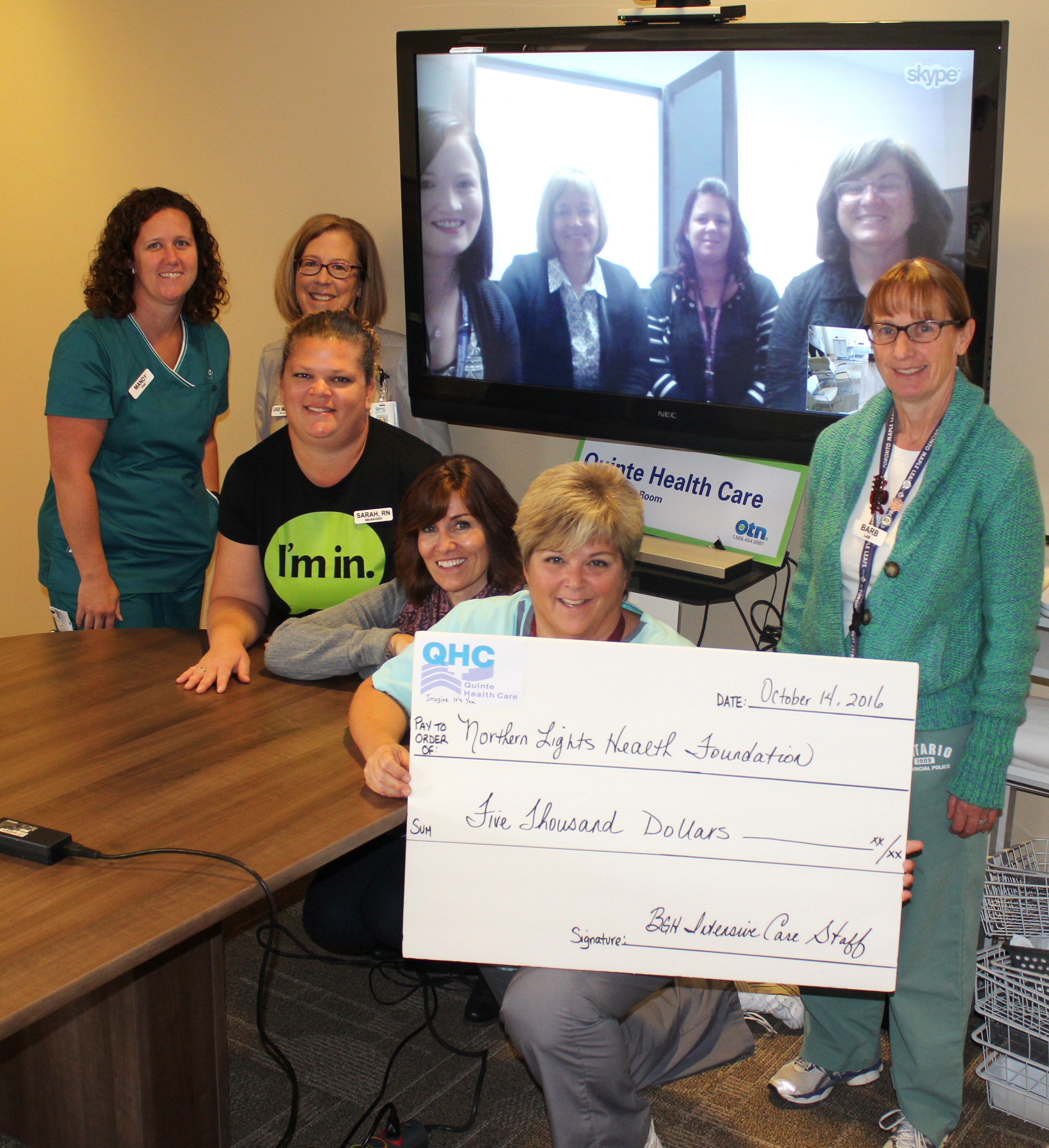 ICU nurses at Belleville General Hospital revealed the $5,000 cheque over Skype to the Northern Lights Health Foundation team and nurses. Photo courtesy of Belleville General Hospital