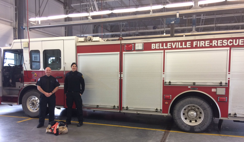 Steve Helm (left) and Jordan Haggerty are probationary firefighters based at Belleville Station 1. Under a provincial law, the full-time firefighters at the station are not allowed to work part-time in neighbouring Quinte West, but they can do part-time work for smaller volunteer departments like Madoc’s. Photo by Rachel Stark, QNet News