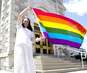 Stacey Love Jolicoeur, who identifies as a two-spirited transgender woman, can be seen holding the gay pride flag at an event in downtown Belleville in June 2016. Photo by Makala Chapman, QNet News