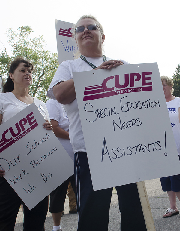 Educational Assistant Beth Pitt joined fellow CUPE workers outdside The Board of Education on Anne St. in Belleville an hour before the board’s scheduled meeting. The provincial government’s slashing of education funding means support staff jobs are being cut as a means of reaching a balanced budget in the Hastings and Prince Edward district. Photo by Gail Paquette