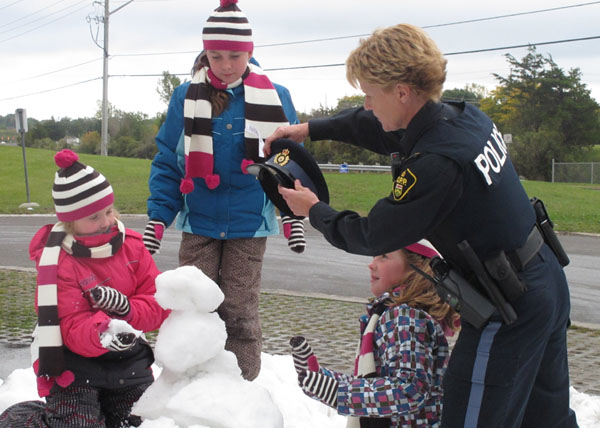 BELLEVILLE, Ont. (03/10/11) From left: Abby, 8, Chloe, 8, and Alisha, 8, make a snowman at the Yardman Arena. Prince Edward County OPP Cst. Kim Guthrie helps them add the finishing touch – a police hat. The girls played in a small pile of snow as part of a press conference given by police, announcing that Radio Adoptions for the local Adopt-A-Child committee has begun. Anyone interested in donating a new children’s coat can call Quinte Broadcasting until Oct. 28 to obtain the name of a child in need. Photo by Renee Rodgers.